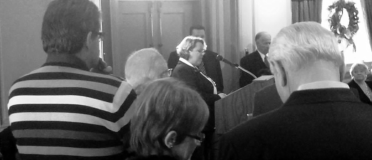 Windsor-Essex REALTORS® support their community. Kim Gazo, President gives a brief speech at the Mayors luncheon prior to presenting a cheque for $3,000 to Willistead Manor.